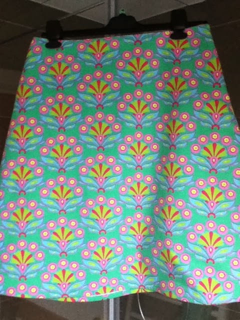 En zo raakte de rok na meer dan een jaar toch nog af. Ik ben nog steeds verliefd op het stofje, maar helaas blijkt het nogal stijf te staan. Het is precies een lampenkap als ik ‘m aan heb!