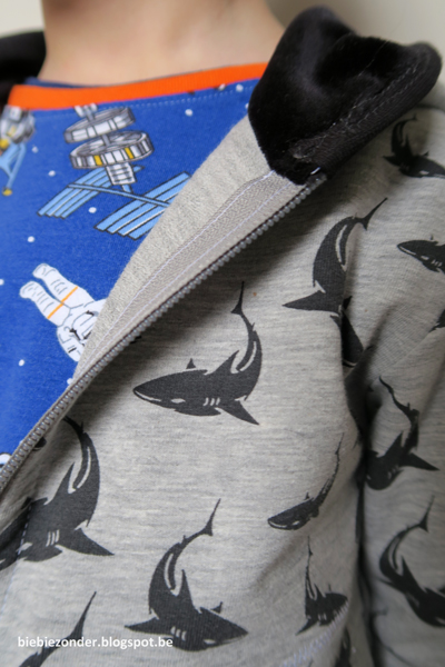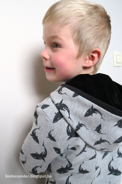Ze stuurde me enkele leuke stofjes op en de eerste die ik onder de schaar nam, is een zomertricot met haaien op. De oudste zoon begint zo zijn eisen te stellen en wilde een trui met een rits. Ik kan niet ontkennen dat dat erg handig is, zo’n truien worden hier eigenlijk heel vaak gedragen.