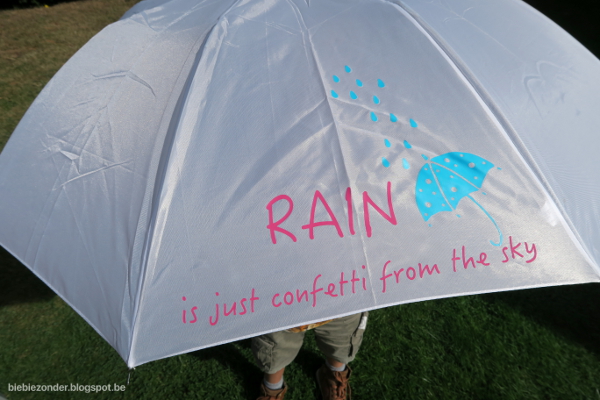 Feeërieke bezorgde mij een witte paraplu en ik ging op zoek naar een quote over de regen die ik ooit eens ergens op een blogje had gezien. Altijd leuk als je daar dan nog een passend beeld bij vindt, wat hier het geval was.